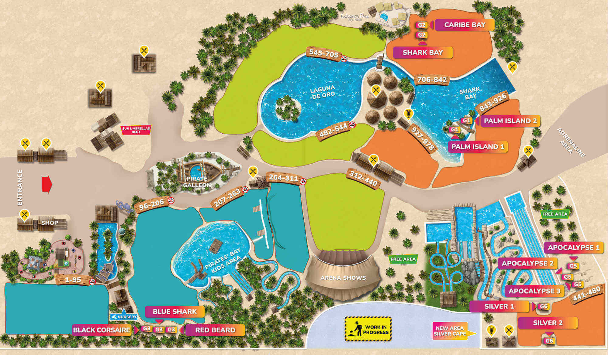 Immergiti nel comfort del gazebo Apocalypse 2, un ampio rifugio sulla sabbia dove lascarti coinvolgere dal richiamo delle onde della vicina Shark Bay. Ideale per gruppi di amici, con spazi sia soleggiati che ombreggiati, è il luogo perfetto per chi cerca un ambiente accogliente vicino agli scivoli più emozionanti del Parco, ai punti ristoro e servizi del Parco.